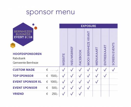 Steun van Bernhezer ondernemers is voor het Bernhezer Business Event van groot belang. Zij stellen de organisatie van het BBE elk jaar in staat het ondernemerschap in Bernheze te stimuleren en ondernemers een podium te bieden. Daarnaast is het een uitstekende manier om uw bedrijf en merk onder de aandacht te brengen. Hieronder de mogelijkheden op een rij. Hebt u interesse vul dan het contactformulier in.